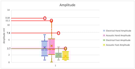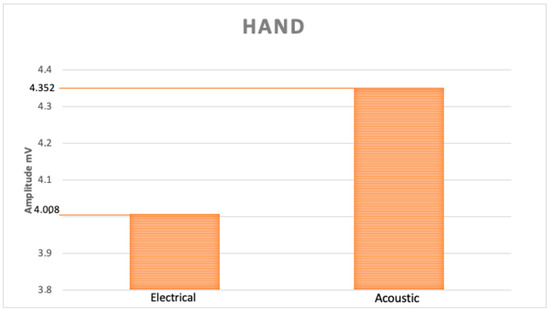 Regarding the amplitude values, descriptive statistical analysis highlights that the average value obtained with electrical stimulus in the hand is lower than that obtained with acoustic stimulus (Figure 1); however, the maximum value is recorded with the electrical one (Figure 2).