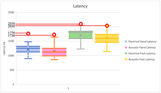 In this study, the maximum latency value results for electrical stimulus, albeit with a negligible difference from the maximum value obtained for acoustic stimulus (1770 vs. 1730 ms in hand, 2050 vs. 2030 ms in foot) (Figure 3).