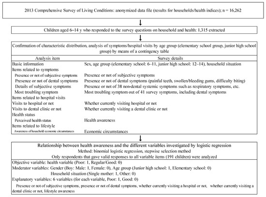A cross-sectional study design was adopted, and data from a single fiscal year were researched. The analysis was conducted according to the protocol shown in the flowchart in Figure 1. A comparative analysis of items was carried out using a contingency table, and the proportions of responses for items such as subjective symptoms, visits to a hospital, dental symptoms, visits to a dentist, living conditions, and perceived health status were compared. Responses for living conditions and health status were coded as either “poor” or “regular/good” for analysis. The analysis of the contingency table used the Χ2 test and Fisher’s exact test.