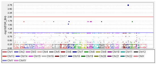 Manhattan plot with a blue line and red line indicating the threshold for genome-wide significance. The x-axis has the chromosome numbers and -log 10 FDR–BH (false discovery rate–Benjamini and Hochberg) adjusted p-value in the y-axis.
