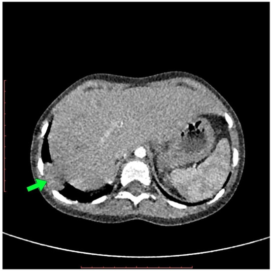 The CT scan in axial projection shows a small, rounded structure in the right dome of the diaphragm with contrast enhancement similar to liver tissue (arrow).