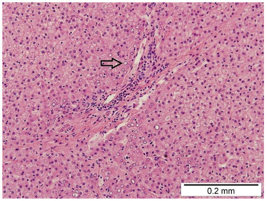 The histopathological examination shows the hepatocytes arranged in one-cell-layer-thick plates separated by sinusoids. No inflammatory cells, no fibrosis, and no steatosis were observed. A few glycogenated nuclei were observed (arrow).