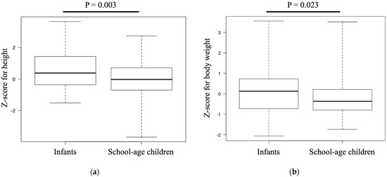 The Z-score for height was significantly greater among infants than among school-age children (0.37 (−0.36–1.42) versus −0.03 (−0.69–0.70), p = 0.003; Figure 1a). Similarly, the Z-score for body weight was significantly greater in infants than in school-age children (0.12 (−0.72–0.72) versus −0.36 (−0.79–0.20), p = 0.023; Figure 1b). There was no difference in the Z-score for the BMI between the two groups (−0.21 (−0.81–0.33) versus −0.29 (−0.97–0.42), p = 0.861).