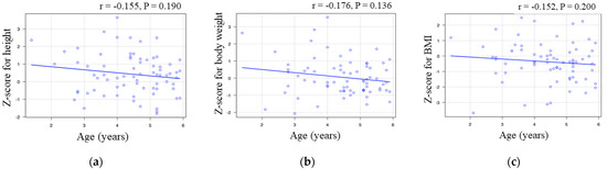 Among infants, there was no correlation between age and the Z-score for height (r = −0.155, p = 0.19; Figure 2a), body weight (r = −0.176, p = 0.136; Figure 2b), and BMI (r = −0.152, p = 0.2; Figure 2c).
