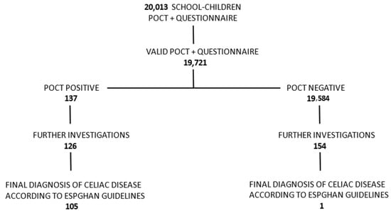 - Primavera, G.; Aiello, A.; Grosso, C.; Trifirò, G.; Costa, S.; Grima, A.; Pallio, S.; Toumi, M.; Magazzu, G.; Pellegrino, S.; et al. Point-of-Care test screening versus Case finding for paediatric coeliac disease: A pragmatic study in primary care. Acta Paediatr. 2020, 110, 337–339. [Google Scholar] [CrossRef] [PubMed]