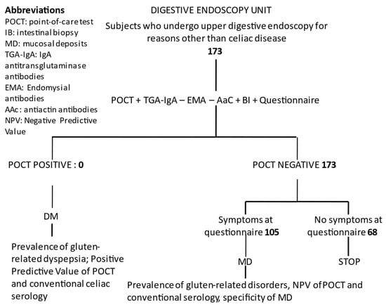 The results of POCT, as well as a photo with the answers of the questionnaire, were anonymously inserted into the database. During the planned endoscopic exam, duodenal biopsy samples were taken for histology and with EMA quantification represented the reference standard. In subjects with symptoms or conditions associated with CD, a sample was frozen in optimal cutting temperature (OCT) and stored at −80 °C until use. The latter were then analyzed for TGA-IgA intestinal mucosal deposits (MD), the presence of which, regardless of serology and histology results, could suspect a relationship with gluten sensitivity [17].