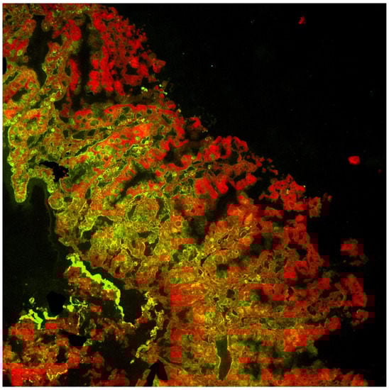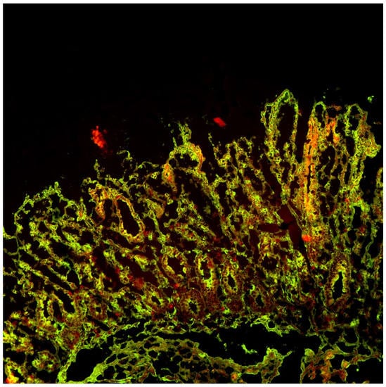 In yellow, the overlap of green and red indicates the deposits of anti-tTG2 on confocal microscopy.