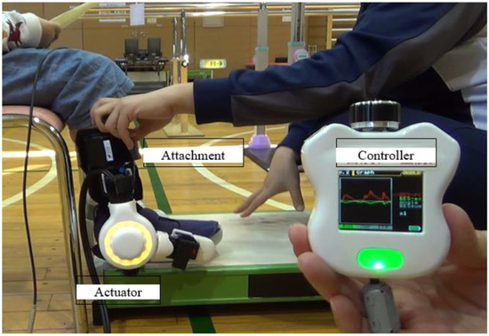 The single-joint Hybrid Assistive Limb (HAL-SJ) (HAL-FS01; Cyberdyne, Inc., Tsukuba, Japan) is a wearable robot that can support flexion and extension movements of various joints. The HAL-SJ has a bioelectrical signal (BES)-based control system and demonstrates joint torque assistance with the wearer’s voluntary movement. The HAL-SJ has been effectively used for knee flexion and extension exercises performed by patients who have undergone total knee arthroplasty and for elbow flexion and extension exercises performed by CP patients with spasticity [13,14]. A new ankle joint unit that makes it possible to perform ankle joint exercises has been developed as an accessory for the HAL-SJ (Figure 1). Ankle rehabilitation using the HAL-SJ has been attempted for adult patients with drop foot, and improvements in muscle activity, strength, and walking speed have been reported [15,16]. However, the results of the use of the HAL-SJ for pediatric patients who have undergone equinus surgery have not yet been reported. We believe that the HAL-SJ is an effective rehabilitation device for those who have undergone equinus corrective surgery. Therefore, we present two cases of robot-assisted ankle rehabilitation using the HAL-SJ for children after equinus surgery.