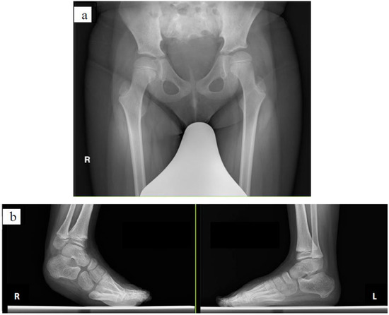 Radiographs of case 1: (a) pelvic radiograph and (b) radiograph of the feet.