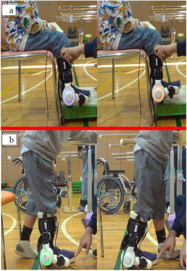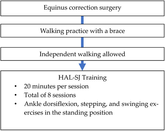 We utilized the HAL-SJ for pediatric patients with ankle disability who underwent equinus corrective surgery. Training with the HAL-SJ was performed postoperatively when patients were allowed to walk without braces (Figure 4). We aimed to perform training with the HAL-SJ for 20 min per session for a total of eight sessions (2–4 sessions per week). Training consisted of ankle dorsiflexion, stepping, and swinging exercises in the standing position with the HAL-SJ attached to the ankle joint on the surgical side (Figure 5a,b). We performed HAL-SJ training in addition to conventional rehabilitation during hospitalization. Physical therapy and occupational therapy were performed for 40–60 min per session; five sessions were performed each week. Physical therapy included stretching, muscle strengthening exercises, physical fitness exercises, and walking practice. Occupational therapy included training to perform activities of daily living.