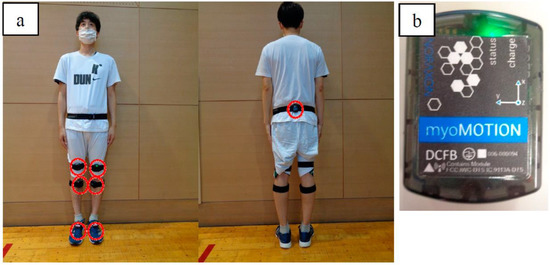 We performed a three-dimensional gait analysis to assess the joint angles of the children during the gait cycle using myoMOTION (Noraxon USA, Scottsdale, AZ, USA), a wireless inertial measurement unit (IMU) system consisting of a receiver and seven IMUs for the lower body (Figure 6a). Each IMU had a local coordinate system and measured acceleration in the following three directions: yaw, pitch, and roll (Figure 6b). Each IMU was placed on the body segments according to the lower body model provided by the IMU system software (myoRESEARCH 3.16.86, Noraxon USA, Scottsdale, AZ, USA). With this model, the body segments to which the IMUs are attached are assumed to be rigid, and each body segment is considered a rigid unit with interconnected joints. Before the measurements were performed, the system was calibrated, with children in the sitting position.