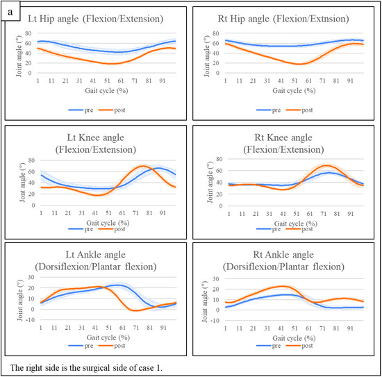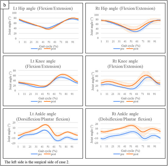 The joint angle waveforms averaged from the gait analysis results of the two participants are displayed (Table 2 and Figure 7a,b). In case 1, the joint angles of hip extension and knee extension during the stance phase on the operated side improved. The mean maximum hip extension angle ranged from −53.75 to −17.71, whereas the mean maximum knee extension angle ranged from −34.91 to −27.61. Furthermore, during the swing phase in case 1, the maximum knee flexion angle improved from 56.19 to 68.59, and the maximum ankle dorsiflexion angle improved from 4.35 to 11.20. In case 2, the joint angles of hip extension during the stance phase on the operated side improved. The mean maximum hip extension angle ranged from −41.23 to −36.57. Furthermore, during the swing phase in case 2, the maximum hip flexion angle improved from 76.43 to 80.26, and the maximum ankle dorsiflexion angle improved from −8.50 to 1.82.