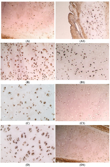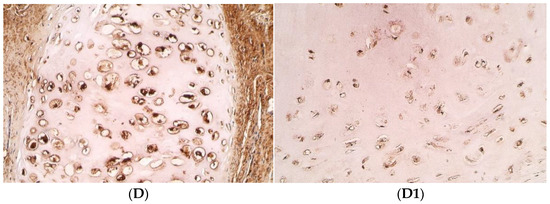 Each sample of cartilage tissue revealed cells that were TIMP-2 positive. Chondrocytes that were TIMP-2 positive in the first-time surgery CLP group differed from +/++ to ++++, in the second-time surgery CLP group—from ++/+++ to +++/++++, while in the control group it differed from +/++ to +++/++++ (see Table 3) (see Figure 1D,D1).
