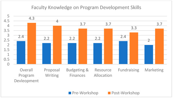 The PDP was run from March to May 2021 with 2 workshops a month. Faculty received dedicated time to attend the PDP without the interruption of clinical duties. All faculty from our Division, which includes 9 physicians and 1 clinical psychologist, participated with experience ranging from junior faculty in practice for less than a year to faculty with over 20 years of clinical practice experience in an academic setting. At the completion of the PDP, faculty reported increased understanding of overall program development with an average score of 4.3 (Figure 1). The largest gains in knowledge were in faculty knowledge on proposal writing and marketing, but faculty reported gains across all domains of developing a program proposal.