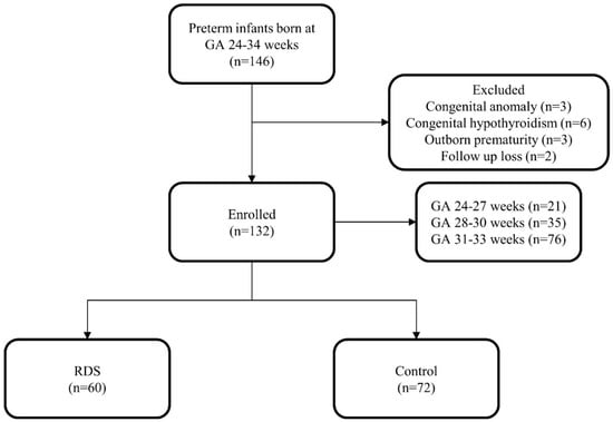 Of the 146 premature infants enrolled in the study, 132 were included for analysis. A total of three infants with congenital anomalies, six infants with congenital hypothyroidism, three out-born infants, and two infants who were lost to follow-up were excluded. There were 60 infants with RDS and 72 infants without RDS (Figure 1).