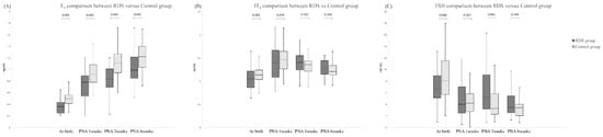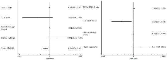 On the day of birth, a lower TSH was significantly associated with an increased risk of RDS after adjustment for significant baseline characteristics, including gestational age, birth weight, and 5 min APGAR (Figure 3). At 3 weeks of age, the T3 level of the RDS groups was significantly lower than that of the control groups after multivariate logistic regression analysis controlling for gestational age and birth weight.