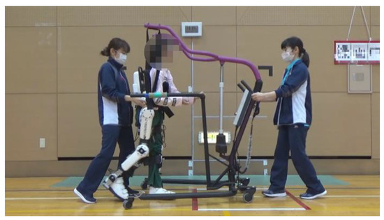 Training using HAL lower limb type S size was initiated after the postoperative fixation period and after the surgeon determined that standing training was possible. Participants underwent the training as reported by Matsuda et al. [6]: approximately 20 min per session, 2–4 times per week for 4 weeks, for a total of 12 sessions, along with usual physical therapy such as muscle stretching or strengthening. The gait training with HAL was performed during the in-patient period. The control mode at the time of intervention was the Cybernic Autonomous Control (CAC) and/or Cybernic Voluntary Control (CVC), depending on patient ability. Before training, flexion/extension balance and assist torque at the hip and knee joints were optimized according to the individual electromyogram signal. To avoid falling, a walking device (All-in-One Walking Trainer, Ropox A/S, Naestved, Denmark) with a harness was used (Figure 1).