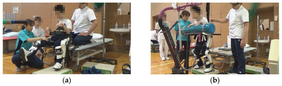 Exercises with the Hybrid Assistive Limb® (HAL) device. (a) Knee flexion and extension exercise in a sitting position with the Hybrid Assistive Limb® (HAL). (b) Squat exercise in a standing position with HAL.