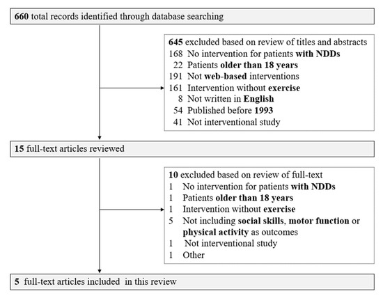 This systematic review was conducted in accordance with the Preferred Reporting Items for Systematic Reviews and Meta-Analyses (PRISMA) statement [12]. The inclusion criteria were as follows: (a) patients with NDDs aged 18 years or younger; (b) include a web-based intervention; (c) include an intervention with exercise training; (d) published from 1994 to 2022; and (e) written in English. NDDs were selected with reference to the criteria of the Diagnostic and Statistical Manual of Mental Disorders, Fifth Edition (DSM-5) [2] or the International Statistical Classification of Diseases and Related Health Problems (ICD-10) [13]. The interventions included were home-based and web-based interventions offered through websites, apps, or social media. The exclusion criteria included (a) studies that were an observational study, review, meta-analysis, or study protocol, and (b) studies that did not include social skills, motor function, or physical activity as the outcomes.