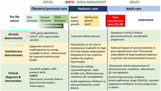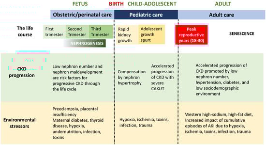 The global prevalence of chronic kidney disease (CKD) is increasing rapidly and is often detected only after a significant loss of function [1]. Epidemiologic studies have revealed that progression of CKD results from the complex interactions of genetic, epigenetic, and the cumulative impact of environmental factors over the life span (Figure 1) [2]. Following the critical discoveries of David Barker and associates that adult cardiovascular disease is linked to low birth weight, the discipline of developmental origins of health and disease (DOHaD) is now firmly established [3]. Importantly, the maternal-fetal and early postnatal environment are now recognized to contribute to the progression of chronic adult disorders including hypertension, diabetes, and CKD (Figure 1) [4]. The prevalence of CKD in the global population increases dramatically in adults over 40 years of age, initially well below 1% in children, rising to greater than 40% in late adulthood [1]. Late progression of CKD was revealed in a study of military recruits with a history of kidney disease in childhood. Even though kidney function was normal in these patients at 18 years of age, they revealed an increased risk of end-stage kidney disease later in adulthood [5]. The present review emphasizes the important role played by the pediatrician, pediatric nephrologist, and pediatric urologist in the long-term health outcome of infants born with reduced nephron number or congenital anomalies of the kidney and urinary tract (CAKUT), both representing a continuum of nephrogenesis under stress [6]. Positioned in health care delivery over the crucial interval between an obstetrician/perinatologist and adult health care provider (internist, nephrologist, and urologist), the pediatrician’s responsibility is to optimize kidney health of the child with CAKUT through the period of the greatest somatic growth (Figure 1).