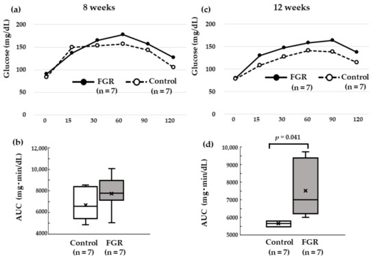 Incremental areas under the curve (iAUC; 0–120 min) of blood glucose: (a,b) At 8 weeks postnatal, median values of iAUC was 7785 (mg·min/dL) in the FGR group (n = 7) and 6585 (mg·min/dL) in the control group (n = 7) (p = 0.19). (c,d) At 12 weeks postnatal, median values of iAUC was 7012 (mg·min/dL) in the FGR group (n = 7) and 5655 (mg·min/dL) in the control group (n = 7) (p = 0.041).