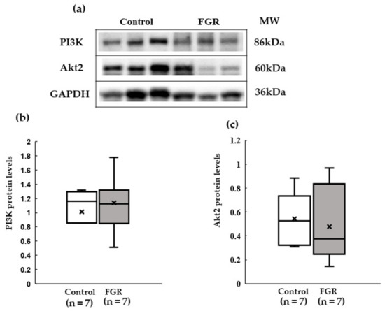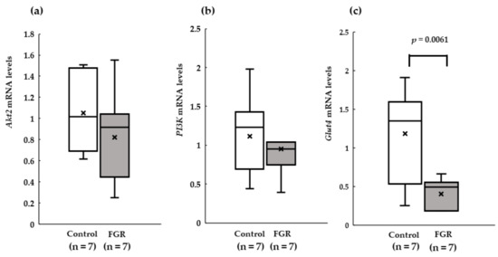 Median values of real-time quantitative reverse transcription–polymerase chain reaction for (a) protein kinase B (Akt2), (b) phosphoinositide 3-kinases (PI3K), and (c) glucose transporter type 4 (Glut4) in the FGR and control groups. The mRNA expression levels of PI3K, Akt2, and Glut4 were normalized to those of β-actin.