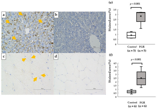 Micrographs of a cross section of the liver and skeletal muscle using immunohistochemistry for adipophilin in a FGR rat ((a): liver, (c): skeletal muscle) and control rat ((b): liver, (d): skeletal muscle) at 12 weeks of age. Increased numbers of adipophilin-positive granules in the liver and muscle fibers were observed in FGR rats. Bar = 100 μm. Median values of the percent-stained area of adipophilin in the liver (e) and skeletal muscle (f).