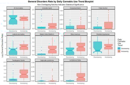 - Reece, A.S.; Hulse, G.K. Broad Spectrum epidemiological contribution of cannabis and other substances to the teratological profile of northern New South Wales: Geospatial and causal inference analysis. BMC Pharmacol. Toxicol. 2020, 21, 75–103. [Google Scholar] [CrossRef]