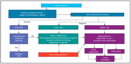 For AVT-non-responders at lower risk, it is advisable to start directly with combined therapy. Since our patient was a non-responder with clinical impairment, we started dual therapy with PDE-5 and ERA after cardiac catheterization. In AVT-non-responders at higher risk, the treatment is based on trepostinil or epoprostenol given intravenously or subcutaneously. In cases involving clinical deterioration, lung transplantation and interventional palliative bridges, such as atrioseptostomy or aorto-pulmonary shunts (Pott’s shunt) must be considered. The last therapeutic option is heart–lung transplantation [