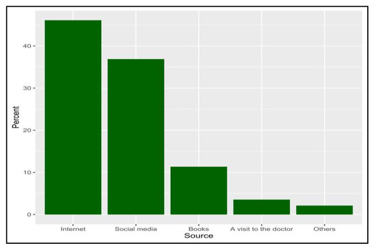 In this survey, it was found that among knowledgeable participants, the Internet was the most common information source (46.1%), with social media, family, and neighbors accounting for the majority of sources for 32.3% of them. This result is predictable because of the Internet. This result is to be expected given that the Internet and social media are the main sources of information for many aspects of life. Statistics show that almost 98% of the Saudi Arabian population uses the Internet, and WhatsApp is the most popular social networking in KSA with 30.67 million users [20].