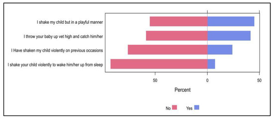 The most frequently reported practices when a baby is crying were carrying the child (54.7%), patting on the child’s back (25.5%), and shaking (16.8%, Figure 2). Less than a half of the participants used to shake their child in a playful manner (44.8%) and throw their baby up high and catch them (41.4%), whereas approximately one-quarter of them (23.9%) had shaken their child violently on previous occasions. Furthermore, only 7.4% of the participants had shaken their child violently to wake them up from sleep (Figure 3).