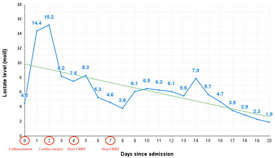 Lactate level trend from admission until the achievement of optimal tissue perfusion, marking the milestones in the timeline: day 0—catheterization, day 2—cardiac surgery, day 4—initiation of continuous renal replacement therapy (CRRT), and day 7—discontinuation of continuous renal replacement therapy.