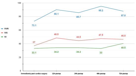 Vasoactive-ventilation-renal score (VVR), vasoactive-inotropic score (VIS), and ventilation index (VI) trend in our patient during the first 72 h post-cardiac surgery.