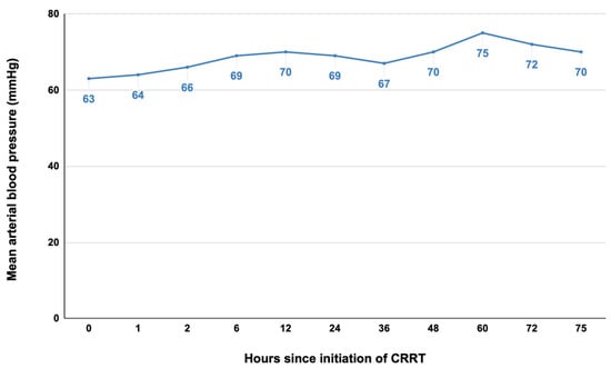 The trend in mean arterial blood pressure during the 75 h of continuous renal replacement therapy.