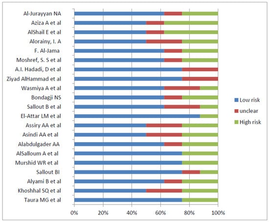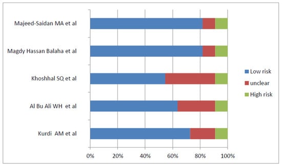 Twelve of the included studies [20,22,23,24,25,29,30,31,39,42,43,44] reported relationships between consanguinity and birth abnormalities, which are highly prevalent in the Saudi population. Other risk factors, such as maternal folic acid supplementation, family history of birth defects or genetic abnormalities, and maternal co-morbidities, were reported in several studies [20,24,26,27,36,39,40,43,45]. Male sex was associated with birth defects in two studies [34,35]; however, female sex was a risk factor in one study [28]. Table S3 shows the risk factors in the five studies for each risk’s related odds ratio.