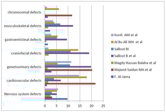 Seven studies assessed the overall birth defects: four in Riyadh, two in Al Ahsa, and one in Al-Khobar. As shown in Figure 4, the most prevalent birth defects were cardiovascular, genitourinary, and craniofacial [20,23,30,36,42,43,44].