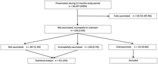 During the 12-month study period, a total of 20,247 patient visits were recorded. Of all visits, 526 (2.6%) visits fulfilled the inclusion criteria of incomplete or no vaccinations. Of this subgroup, 411 visits (78.1% [cohort]) had either incomplete (27.4%) or no vaccination (50.7%). For 115 visits (21.9% [cohort]; 0.6% [all visits]), the vaccination status notes were void, resulting in an unknown vaccination status. (Figure 1).