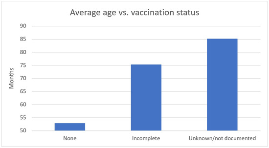 In our sample, slightly fewer children were female (44% among the 411 visits analyzed) among the incompletely vaccinated and unvaccinated. The average age of the undervaccinated subgroup was 66 months (5.5 years of age) (Figure 2).