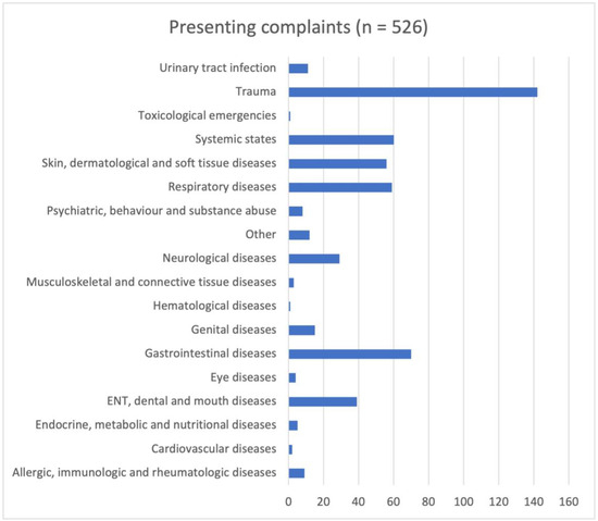 No difference in vaccination status was found for medical or surgical presentation groups (Χ2 (2, n = 411) = 0.475, p = 0.491 (p value = 0.065). Allocation into Pediatric Emergency Care Applied Research Network (PECARN) diagnosis categories [24] showed most visits occurred for trauma, followed by gastrointestinal problems, systemic states such as fever, viral, bacterial, or fungal infection or respiratory diseases (Figure 4). In our cohort, there were no cases of VPD.