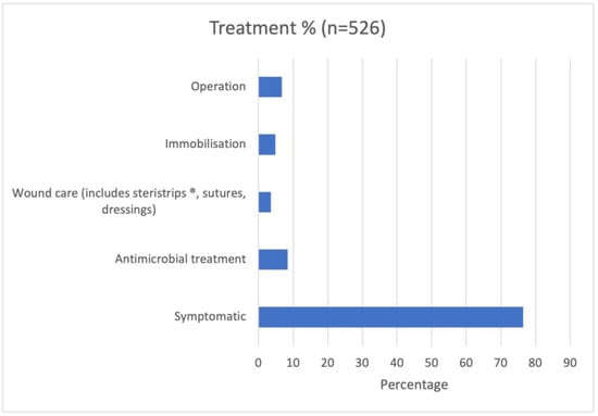 The most frequent treatments were symptomatic treatment only (76.4%), antimicrobial treatment (8.4%), operation (6.7%), immobilization (4.9%), and wound care (including Steristrips®, sutures, dressings) (3.6%) (Figure 5).