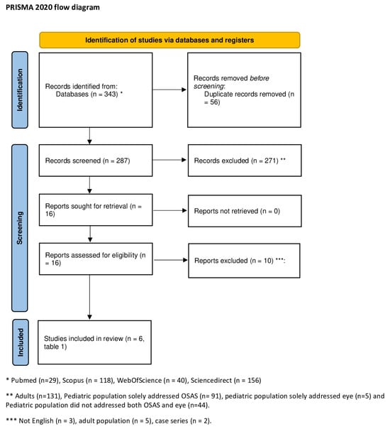 The initial search identified 343 articles, comprising 29 from PubMed, 118 from Scopus, 40 from Web of Science and 156 from ScienceDirect. Duplicate reports were subsequently excluded, removing 56 articles and leaving 29 from PubMed, 91 from Scopus, 14 from Web of Science, and 153 from ScienceDirect for further consideration (Figure 1, PRISMA). Concerning article relevance, 271 articles were excluded. Among these, 131 were associated with the adult population, while 140 pertained to the pediatric population. The latter group of papers was further categorized into three subgroups: articles excluded because they solely addressed OSA without any mention of ocular pathology (91 reports identified), articles related to ocular pathology but not OSA (5 articles placed), and articles not associated with either OSA or ocular pathology (44 articles identified). Subsequently, three articles with full text in languages other than English were excluded. Additionally, two papers were excluded due to their classification as case reports or case series, and five articles were excluded because they pertained to adulthood. Ultimately, the search yielded six relevant articles (Table 1), all related to the pediatric population and available in English.