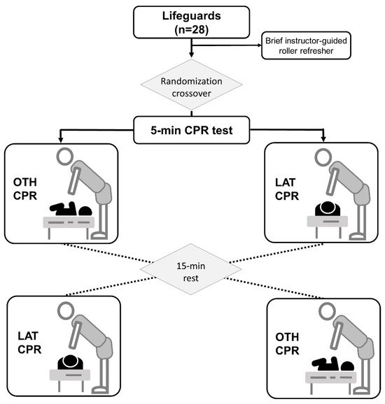 Flow-chart and design. CPR: cardiopulmonary resuscitation; OTH: over-the-head; LAT: lateral.