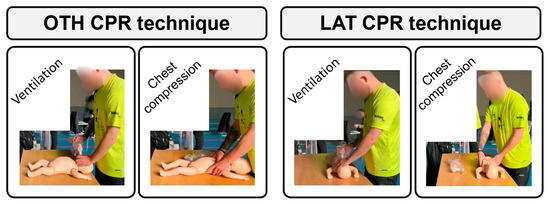 In infant CPR and in drowning cases, it is key to treat hypoxia as soon as possible because this is a potentially reversible cause of cardiac arrest [1,2,3]. According to the guidelines set forth by the European Resuscitation Council, it is recommended that the process of resuscitating infants commence with the administration of five initial rescue breaths before progressing to a combination of ventilation and chest compressions [3]. In optimal conditions, with the aim of improving ventilation in cardiac arrest cases in infants, a 15:2 ratio (chest compressions:breaths) is recommended when at least two trained first responders are on hand. One of them would position themselves to perform the ventilations, while the other would be responsible for administering chest compressions. Further, the use of pediatric bag-mask ventilation is recommended when performing ventilation [3]. In this setup, the first responder is advised to position themselves over the infant’s head (over-the-head: OTH), as this position allows for more effective ventilation from a technical perspective even when the procedures are carried out by healthcare experts [4]. Simultaneously, the task of administering chest compressions is undertaken by a second responder. This designated approach ensures a comprehensive and coordinated resuscitation strategy, maximizing the chances of successful outcomes during critical interventions.