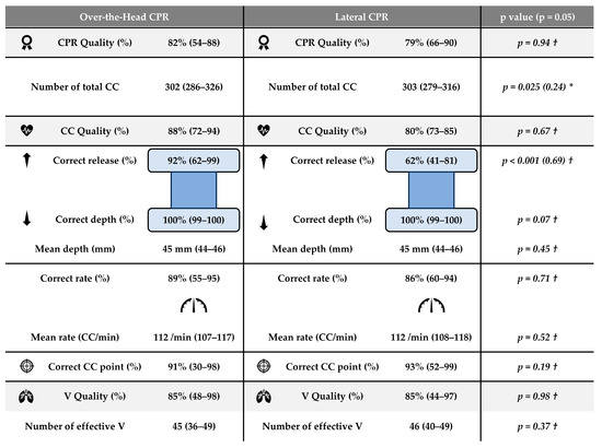 The results obtained from the cardiopulmonary resuscitation (CPR) test variables are graphically represented in Figure 3. CPR quality of greater than 70% was achieved using both resuscitation techniques with no statistically significant differences emerging between the two examined conditions (OTH: 82%; IQR 54–88% vs. LAT: 79%; IQR 66–90%, p = 0.94). CC quality also showed that values above 70% were achieved using both resuscitation techniques with no significant differences between the two conditions examined (OTH: 88%; IQR 72–94%; vs. LAT: 80%; IQR 73–85%, p = 0.67). Values above 70% were also found for the variable V quality, with no differences between the two techniques (OTH: 85%; IQR 48–98% vs. LAT: 85%; IQR 44–97%, p = 0.98). The only variables where significant differences were found were correct release, where OTH had higher values than LAT (OTH: 92%; IQR 62–99% vs. LAT: 62%; IQR 41–81%, p < 0.001), and the number of total CC, where OTH had lower values than LAT (OTH: 302 CC; IQR 286–326 CC vs. LAT: 303 CC; IQR 279–316%, p = 0.025). Furthermore, the other resuscitation variables studied showed no significant differences between the two techniques examined: correct depth (OTH: 100%; IQR 99–100% vs. LAT: 100%; IQR 99–100%, p = 0.07); mean depth (OTH: 45 mm; IQR 44–46 mm vs. LAT: 45 mm; IQR 44–46 mm, p = 0.45); correct rate (OTH: 89%; IQR 55–95% vs. LAT: 86%; IQR 60–94%, p = 0.71); mean rate (OTH: 112 CC/min; IQR 107–117 CC/min vs. LAT: 112 CC/min; IQR 108–118 CC/min, p = 0.52); correct CC point (OTH: 91%; IQR 30–98% vs. LAT: 93%; IQR 52–99%, p = 0.19); and number of effective V (OTH: 45 V; IQR 36–49 V vs. LAT: 46 V; IQR 40–49 V, p = 0.37).