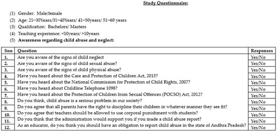 The questionnaire was divided into two sections; section one included gender, age, and experience, and section two involved 12 questions on awareness of CAN. Finally, the questionnaire consisting of 12 questions (Figure 1) regarding awareness was created by considering all the relevant changes the subject experts and the participants provided. The questionnaire involved two sections: demographic characteristics and awareness questionnaire. The demographic questions involved gender (male and female), age (>30 years, 31–40 years, 41–50 years, and 51–60 years), experience (<10 years and >10 years), and education (bachelor and master). The awareness questionnaire involved the Care and Protection of Children Act, 2015 [15], the National Commission for Protection of Child Rights, 2007 [16], and the Protection of Children from Sexual Offences (POCSO) Act, 2012 [17].