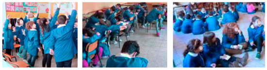 Several studies have shown that, in fact, short active breaks are effective at increasing physical activity levels, enjoyment, and the desire to learn [40,41,42]. However, the requests and directives from teachers, a very large and varied school curriculum, greater attention given to standardized tests, and some constraints related to educational institutions are among the main factors that limit the planning of such interventions in schools [43]. For this reason, periods of active breaks are considered important from an educational point of view and have great pedagogical value because they provide the opportunity to acquire various skills that are useful for the child’s life: the ability to collaborate, manage relationships among peers, follow common rules, confrontation, and autonomy [44]. In summary, we can describe ABs as small intervals characterized by the practice of physical activity carried out by teachers during daily disciplinary activities within the classroom context during curricular lessons [45]. They were started with the intention of increasing the amount of daily physical activity in the current rather sedentary childhood generations. Over time, they have proven to be effective at improving the psycho-physical well-being of children, their behavior, and the overall climate of the class, as well as in teachers. In fact, their practice seems to improve the quality of school life, including social behavior, attention, concentration, and involvement in activities [46]. ABs offer teachers the possibility of organizing breaks in relation to different factors and situations, making them very flexible and adaptable to the school context and specific classes [47]. Their duration can range from 3 to 15/20 min, and their realization, generally in the classroom near one’s desk, has also opened to the outdoor environment, such as the school playground, where some teachers feel safer and better able to conduct the planned activities [Figure 1].