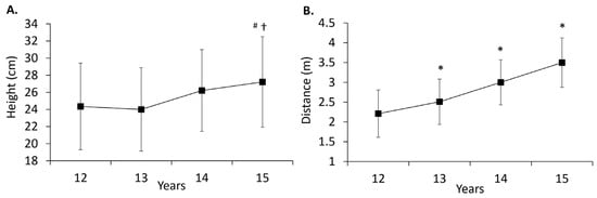 CMJ height (A) and MBCT distance (B) across age groups. Data are presented as mean ± SD. Asterisk (*) indicates significant differences to earlier and later age groups; dagger (†) indicates significant difference compared to 13 years; and number sign (#) indicates significant difference compared to 12 years. Statistical significance set at p < 0.05.