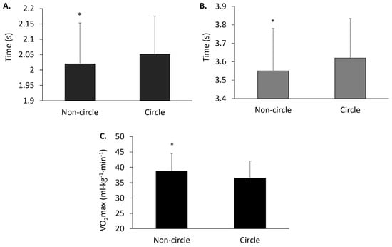 10 m sprint (A), 20 m sprint (B), and VO2max (C) for non-circle and circle playing positions. Data are presented as mean ± SD. Asterisk (*) indicates significant difference compared to circle position. Statistical significance set at p < 0.05.