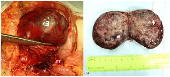 (a) Intraoperative aspects showing a large, relatively exophytic, encapsulated mass (T) into the pancreatic body, compressing but without invading the portal vein (PV); (b) the cut surface of the operative specimen (central pancreatectomy for pancreatoblastoma) showing an encapsulated heterogenous mass with cystic and hemorrhagic components (white arrows) (PH—pancreatic head; PT—pancreatic tail).