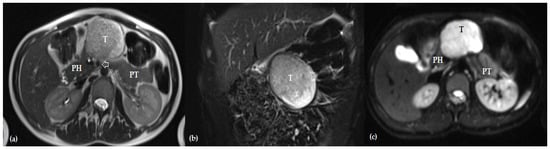 (a) Axial and (b) coronal T2-weighted magnetic resonance images showing a large, relatively exophytic, well-circumscribed mass in the pancreatic body (T) that is heterogeneously hyperintense relative to the nearby pancreatic parenchyma, compressing but without invading the portal vein (*) or superior mesenteric artery (white arrow); (c) axial diffusion-weighted magnetic resonance imaging showing the mass in the pancreatic body (T) with restricted diffusion compared with the nearby pancreatic parenchyma (PH—pancreatic head; PT—pancreatic tail).